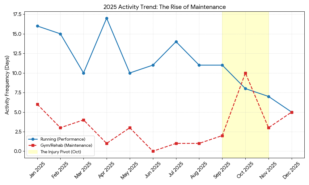 In 2024, I was running at high availability (197 days). By 2025, my ‘uptime’ dropped to 157 days, but my ‘load’ per active day actually increased. I was pushing 6.7 miles per run compared to 5.8 the year before. My system was under-provisioned for the load I was giving it.