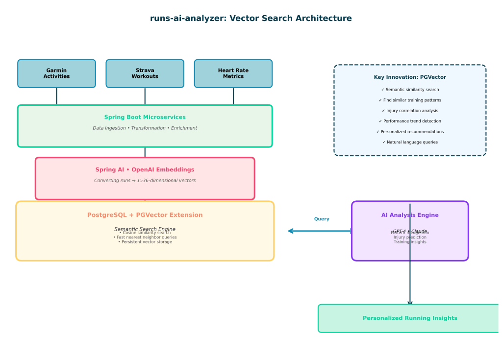 In my previous post, I shared the story of four marathons, plantar fasciitis, and a painful realization: every running app pushed me toward my goals, but none of them understood what my body could actually handle. I talked about watching my sub-4:30 dream slip away while my training apps kept urging me forward, oblivious to the red flags my body was sending. That post ended with a promise. I mentioned building a Spring Boot + AI application—an “injury-aware coach” that would refuse to push me when my body showed warning signs. This post is the technical deep-dive into that system: runs-ai-analyzer. This isn’t just another fitness tracker. It’s the build-out of the AI Advisor layer I referenced in my previous architecture diagram—the piece that sits on top of the run-data queue, looks at injury history, and decides if the ‘system’ needs a forced reboot. More specifically, this is about how I used PostgreSQL’s PGVector extension to implement smart caching for AI-powered running analysis.