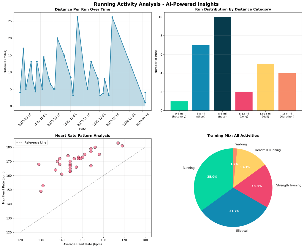 - Marathon distance (15+ miles): 13.8% — including that 26.2-mile Dallas Marathon The heart rate data tells another story. My average HR across all runs sits at 146 bpm, with max heart rates consistently hitting 165-180 bpm during hard efforts. That’s the kind of pattern an AI can learn from.